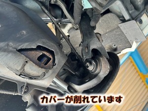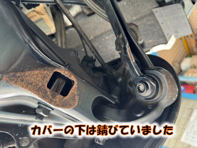 カバーを外してみると削れていた部分に沿ってロアアームが錆びていました。